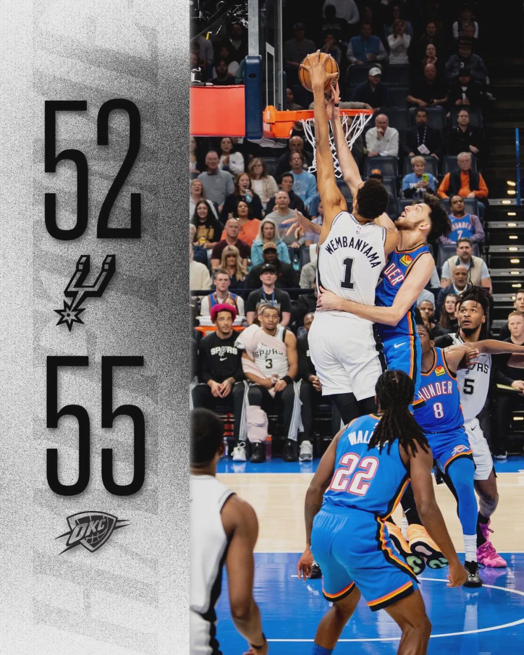 亚历山大进攻效率下降,第二节马刺26-23追回3分。上半场打完,雷霆55-52依然领先3分。亚历山大半场砍下15+3+1;文班亚马10分5板1帽、卡斯尔10分3板2助、哈珀9分2板2助。福克斯状态不佳,3投1中仅得2分3篮板3助攻。